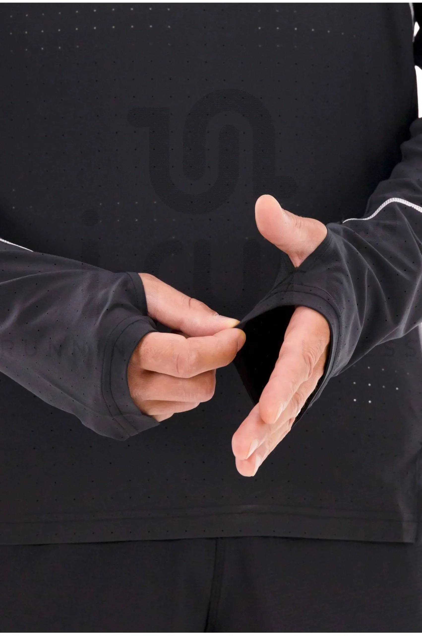 Le tissu stretch promet une grande liberté de mouvement et les passe-pouces améliorent la tenue du vêtement.